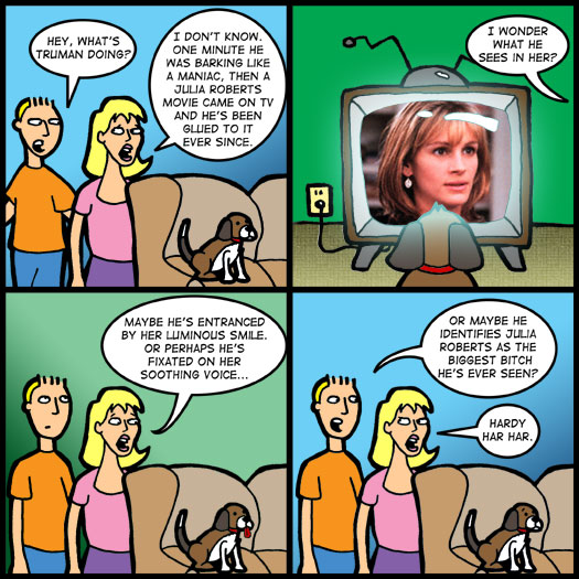 But seriously, ever since I put the strip together, she’s been bugging me to stick our 7 month old beagle Truman into a strip. She’s also been bugging me to make a Julia Roberts joke. This is odd because, to my knowledge, she’s a fan. How else can I explain to my friends that Runaway Bride is in our DVD collection? It wasn’t one of my picks!
