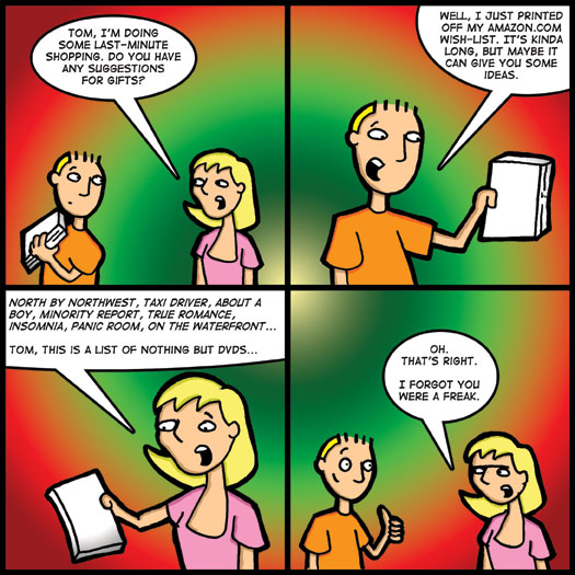 Today’s strip is based pretty close to reality. I really do have a Amazon wish-list about that thick. It’s something like 10 pages. A lot of my friends and family were asking me what I wanted for Christmas and my birthday. So instead of trying to keep track of what items I asked for from which people, I just directed them to my wish list.