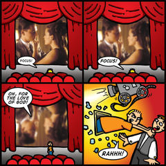 I know the art is a little on the light side for today’s strip, but I figured since I went to some effort trying to figure out how to draw myself lunging through a projectionist booth window WHILE strangling a guy, I deserved a break.