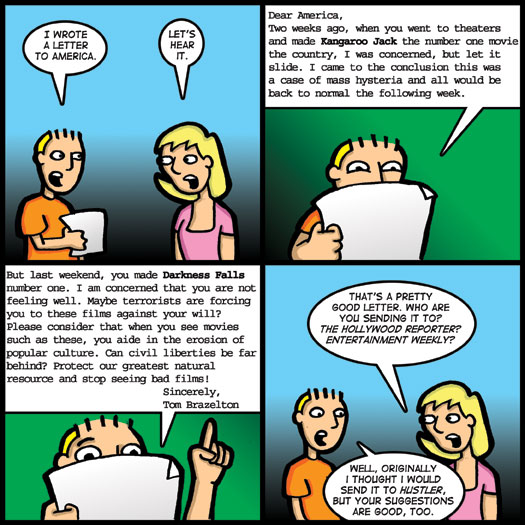 But last weekend, you made Darkness Falls number one. I am concerned that you are not feeling well. Maybe terrorists are forcing you to see these films against your will? Please consider that when you see movies such as these, you aid in the erosion of popular culture. Can civil liberties be far behind? Protect our greatest natural resource and stop seeing bad films!