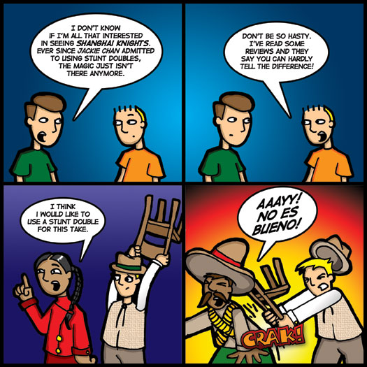Truth be told, some critics believe that Chan is steadily inventing a new style of stunt work that still looks amazing without being physically taxing. In a review of Shanghai Knights, Entertainment Weekly critic Lisa Schwarzbaum says, “Chan is now perfecting a stay-put style no less inventive in its construction. In place of a younger man’s gymnastics, he favors mature brain work, expressed in dazzling strategy.. His is a talent not so much cooling down as getting cool in middle age.” Incidentally, she gave the film a grade of “B”.