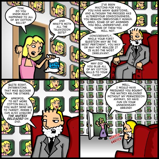 Personally, one of my favorite scenes in Reloaded was the one spoofed in today’s comic – Neo meeting The Architect. I thought the dialogue was rich and interesting, even if it was a bit wordy. I look at that scene as the lynch pin of the movie – everything before it and after it somehow relates to what was revealed in its running time.
