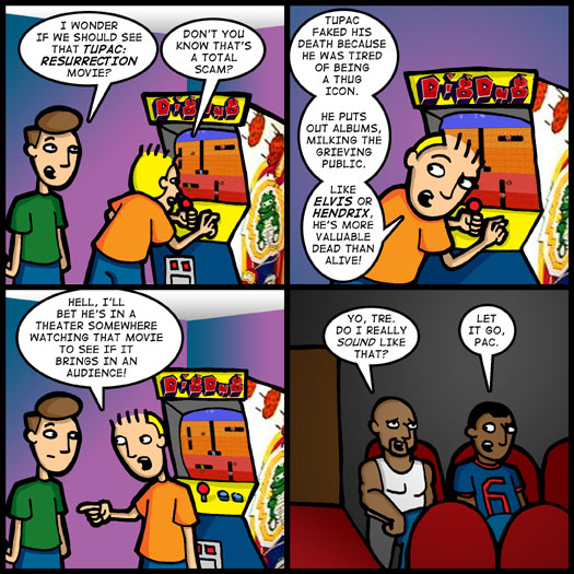 It should be noted that I am totally talking out of my ass with today’s comic. Although I am fascinated by the legacy that Tupac Shakur left behind and the many conspiracy theories regarding his death, I don’t own a single one of his albums and, at the end of the day, I’m just a lame white guy from Iowa who can’t really relate to what Tupac meant to the people he left behind.