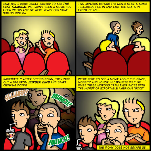 We’re here to see a movie about the grace, nobility, and honor in Japanese culture while these morons cram their faces with the worst of exportable American “food”.