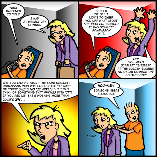 Cami’s take on Scarlett Johansson (while not as violent) is pretty fairly represented in today’s comic. I dunno. She just doesn’t like her. Thinks she has attitude. Doesn’t work well with others. In a way, I can see it. Part of me knows that there won’t be much left for her once she grows out of her ingenue phase. She seems cold. Distant. A little W.A.S.P.y… Is it just me?