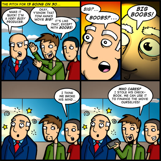 Oh, well. My joke is more about a studio executive being so captivated by the concept of giant breasts that he wouldn’t notice a couple of lowly screen writers stealing his checkbook to make a hack movie. Call it a reflection of the male condition. It makes it sound more educated.