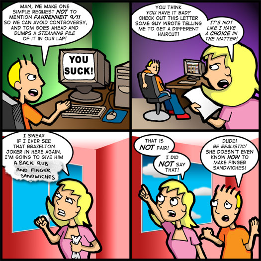 Really the comics of the last two days don’t have anything to do with Moore’s movie. They weren’t a collaboration of his political or a statement against President Bush.