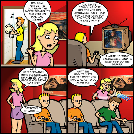 For those of you not in the loop, we’re in the middle of a storyline where Jimmy has lost his job at the movie theater, lost his apartment and is now shacking up with The Brazeltons. If you’d like to see where it all began, you can click here.