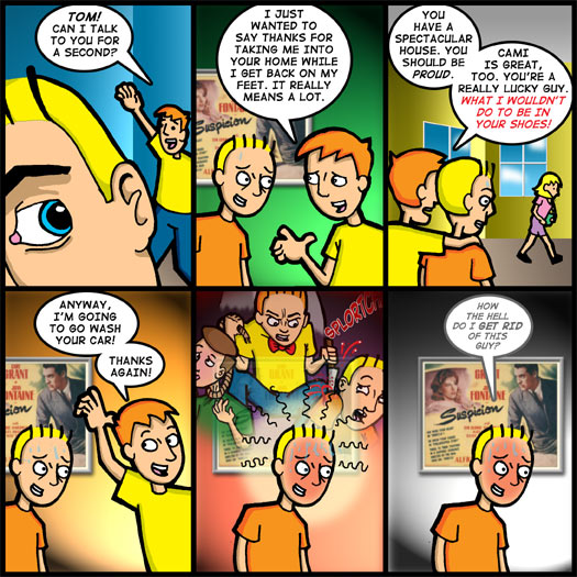 Curse an overtly polite Midwestern upbringing! Tom has it in his head that Jimmy is trying to take his place, but he’s took locked into his hospitality that he can’t do anything about it.