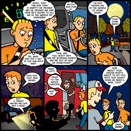 I know it seems like the narrative has been jumping around a little bit these last few strips. Tom hopped into the car with Jimmy on Wednesday and it seemed his paranoia went out the window. Now today’s he’s driving, but the car is out of gas! What’s going on?