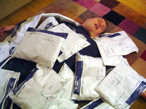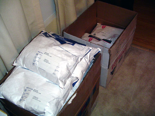 That’s not all of the packages, obviously. Just enough to give you the idea it was a lot. Here’s a picture of all the envelopes in a tidy box, ready to be taken to the fine folks at the Unites States Postal Service…