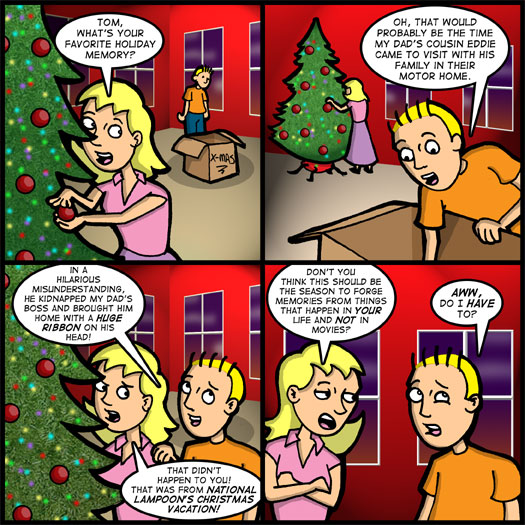Regarding the comic, it wouldn’t be totally out of bounds for real life Tom to fill in the blanks of the holiday season with scenes from a Chevy Chase movie. That’s not to say my holidays are boring or unmemorable. It’s just that my extended family is pretty small, so we usually avoid the petty conflicts, drunken debauchery and shoddy re-gifting that seems to plague other families this time of year. Friends with larger broods tell me to count my blessings, but I have a distinct feeling I’m missing out on some pretty ripe comedy in those situations.
