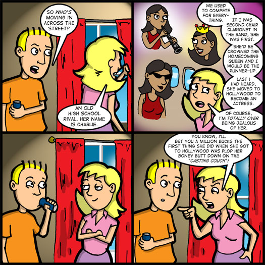 Before posting today’s comic, I showed Cami a rough draft. She was very concerned about being portrayed as “another jealous female”, so once again I need to make the distinction to the audience that the “REAL” Cami is nothing like what you see in the comic.