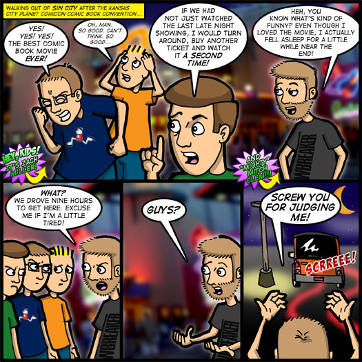 The events in today’s comic are 50% true. Mitch ∗did∗ actually fall asleep near the end of Sin City and sheepishly admitted so. We didn’t strand him in the theater parking lot because…
