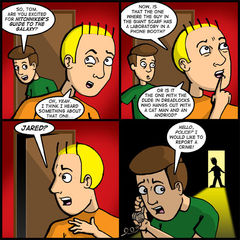 Incidentally, the two other franchises Tom is confusing Hitchhiker’s Guide to the Galaxy with in panel two is Doctor Who and Red Dwarf, respectively. But, of course, any self-respecting nerd already knows that.