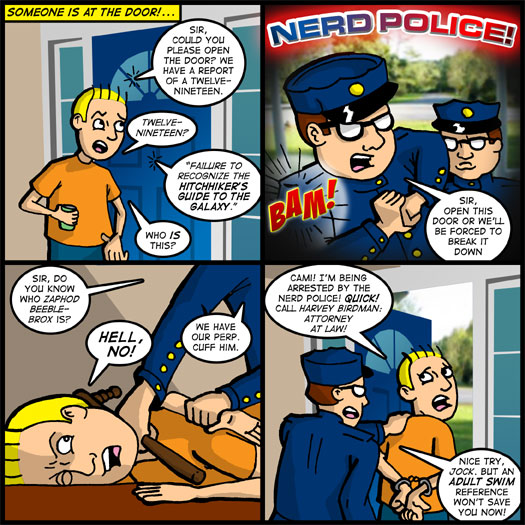 I originally envisioned the Nerd Police as being far less threatening. Original design drafts depicted them as fatter, not as quick on the uptake and their fingers coated in Chee-tos dust. I wanted Tom to have the upper hand the entire time, even as he was being carted off. I wanted him to play along as a means of boosting these nerds self-esteem.