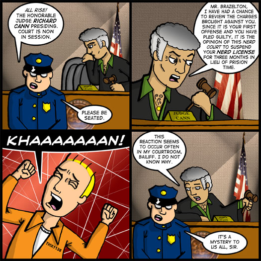 Mr. Brazelton, I have had a chance to review the charges brought against you. Since it is your first offense and your have pled guilty, it is the opinion of this Nerd Court to suspend your nerd license for three months in lieu of prison time.