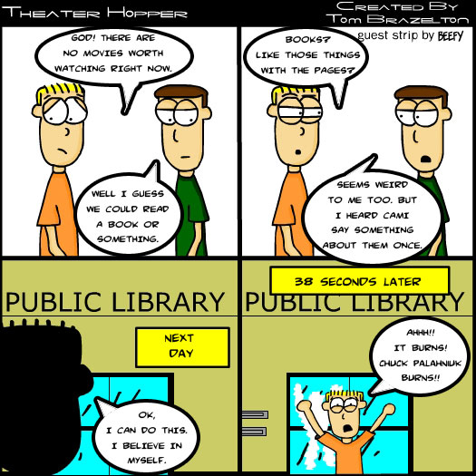 I feel bad because this is a guest comic Beefy made for me AGES ago and I kept promising to put it up. For whatever reason, things didn’t work out the last couple of times I ran guest strips. Mostly I think it had to do with math. Meaning, if I had run his strip, I would have one day of a new week with a guest strip and the remaining two days with new content from yours truly. And since I’m really anal about that kind of thing, I never ran the comic. Stupid math!