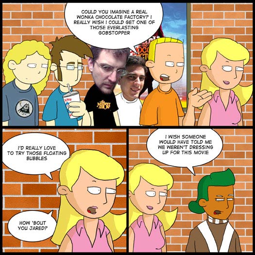 At any rate, I thought Dave’s guest strip was very timely considering Charlie’s $50+ take at the box office this weekend. It would be a shame to waste it. Extra points for getting Jared into an Oompa-Loompa costume!
