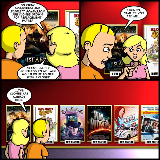 Personally, I think Tom’s complaint in the last panel holds water. There have been an unusual number of remakes this summer even without counting the quasi-meta Bewitched. Don’t forget the sequels, either. Batman Begins and Star Wars – Episode III: Revenge of the Sith could be considered guilty parties since they’re also peddling the same characters and stories we seen before.