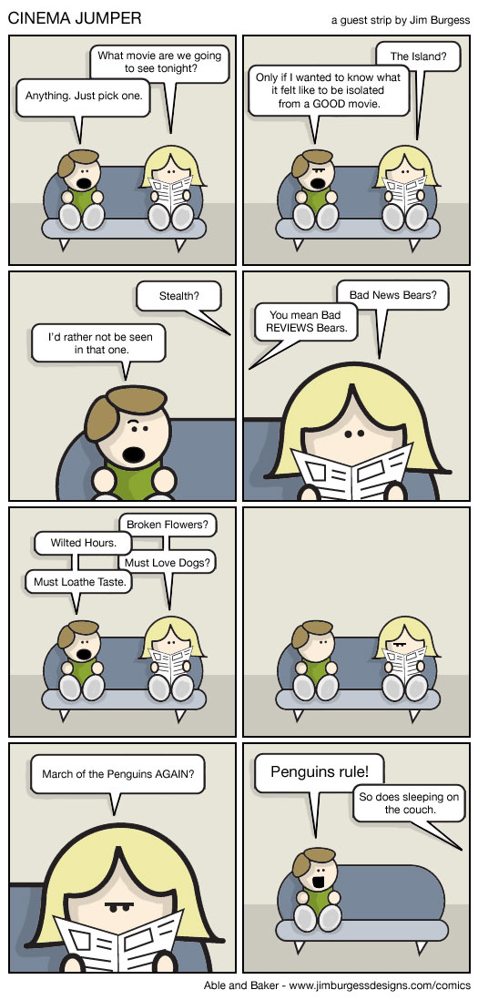 But you are in very capable hands this week. Take for example my fellow Dayfree compatriot Jim Burgess from Able and Baker who was able to whip up today’s excellent guest strip. It pays homage to both Theater Hopper and Little Gamers at the same time! Well done, old man!