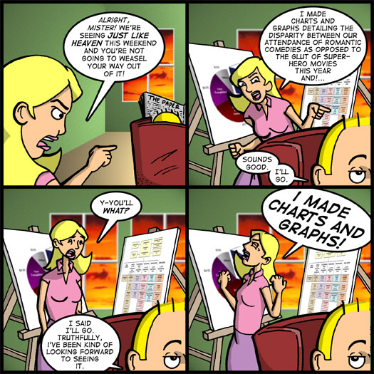 I made charts and graphs detailing the disparity between our attendance of romantic comedies as opposed to the glut of super hero movies this year and!