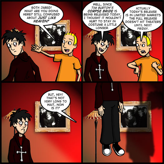 No really commentary for today except to say that Cami and I are planning to paint the afternoon red when we catch a matinee of Just Like Heaven on Sunday. After that, expect a full week of strips continuing to have fun with The Corpse Bride.