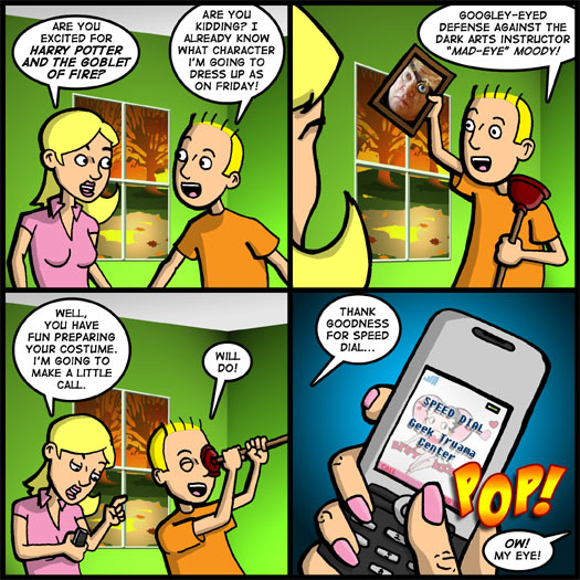 The Geek Truama Center was always a concept I wanted to explore further. It seems people are always doing stupid things to injure themselves. It stood to reason that geeks – being more devoted – would go to further and more bizarre lengths to do so. Plus, the character of "Mad-Eye" Moody from Harry Potter and The Goblet of Fire is already so visually striking, it would seem a shame to cover the movie and not mention him. Plus, I thought it sounded really funny to have Tom try to extract his eye with a toilet plunger.