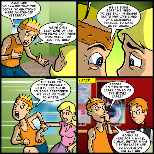I’m not entirely sure what headbands and tank tops have to do with watching movies, but the fact that Cami and I have only seen one of the four nominated films this year if a distinct reflection of our slack attitude this year.