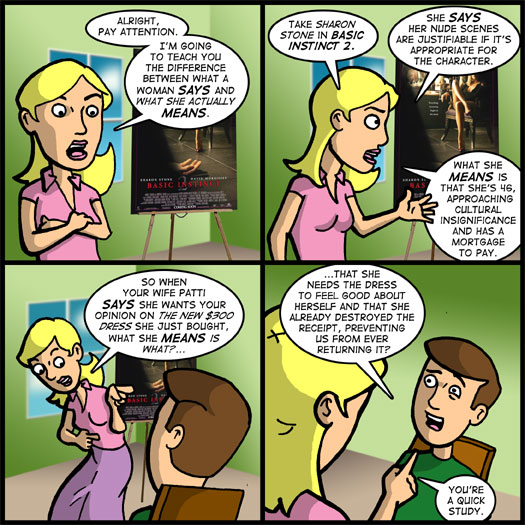So when your wife Patti SAYS she wants your opinion on the new $300 dress she just bought, what she MEANS is what?...