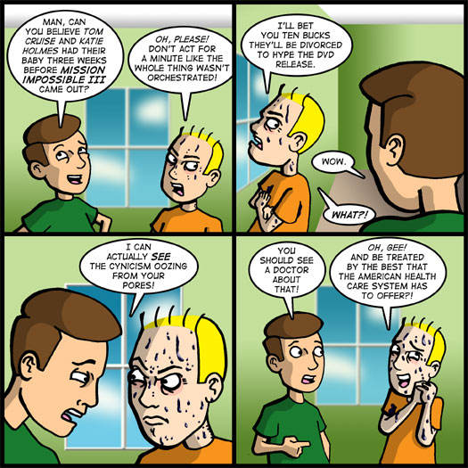 I couldn’t really figure out what somone with cynicism oozing from their pores might look like, but in this comic, I look positively diseased! I think this has to be the most unattractive rendering of myself in three and a half years of comics. What can I say? I’m under a lot of stress right now and I’ve decided to deal with it through the comic.