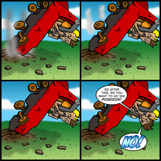 Is today’s comic a little bit of a cheat? Yeah, but I needed a break after drawing all that cray-zay coaster action on Wednesday. Plus, I thought it worked really well for the pacing. Really, I just like the idea of being a participant of a disaster, being stuck upside down and then casually suggesting Poseidon as an entertainment option.
