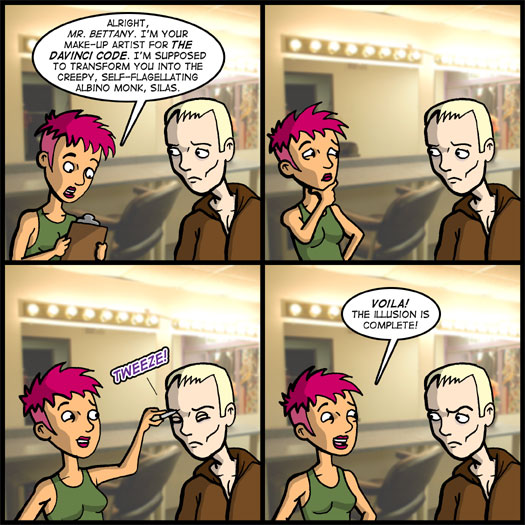 We went to see The DaVinci Code last weekend and – as capivated as I was by Paul Bettany’s performance – it struck me that it wasn’t much of a stretch in casting a painfully pale and pasty Brit to play the albino monk. In the back of my head, I always kind of thought Bettany was an albino anyway. Something about his giant forehead and his nearly transparent eyebrows.