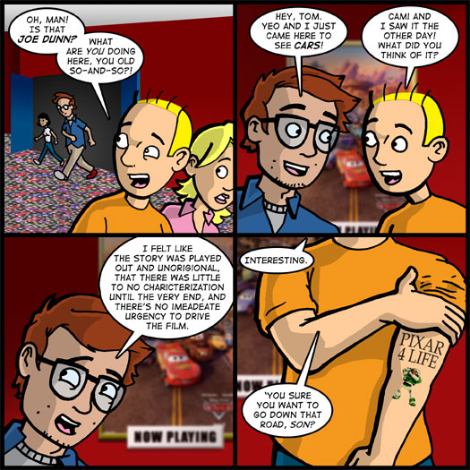 Joe and I have disagreed on movies before, so I don’t know what it is about Cars that I felt I had to defend it in a comic. Honestly, there’s not much to it. I was writing the comic backwards more than anything else. I came up with the Buzz Lightyear tattoo and needed to figure out a reason why Tom would roll up his sleeve to display it. My little conversation with Joe seemed like a good opportunity. And, frankly, I think the guy is really cool and I wanted to sent another shout out his way!