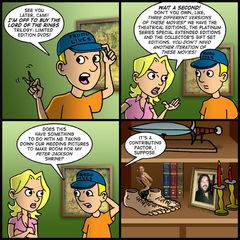 Yesterday The Lord of the Rings Trillogy: Limited Edition DVDs landed on shelves. Apparently there was some great demand for another DVD collection of these movies that are no less than three years old. This time around, they compile the theatrical editions along with the extended editions. But for a limited time! This is what we call "quadruple dipping." Seriously, Peter Jackson is getting worse than that George Lucas fellow.