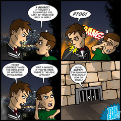 Apologies for the lack of in-depth blog this morning. I stayed up really late on Tuesday night putting this together. I hope you guys appreciate some of the different visual tricks I’m trying. I was just getting sick of the 4 panel routine, especially after the first few strips that set up this arc. Seems to be what I resort to during these longer arcs. Time for action!