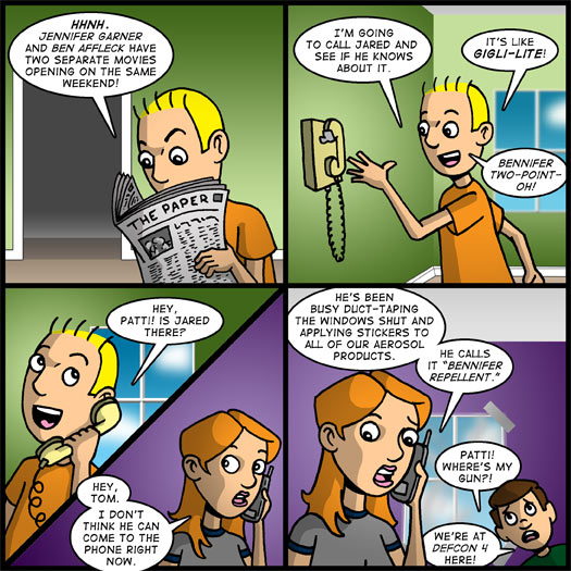 The two movies Tom is referencing in today’s strip are Catch and Release (starring Jennifer Garner) and Smokin’ Aces (with Ben Affleck). Smokin’ Aces is really more of an ensemble piece, so I’m not sure it actually qualifies as a “Ben Affleck movie.” More like a movie Ben Affleck happens to be in.