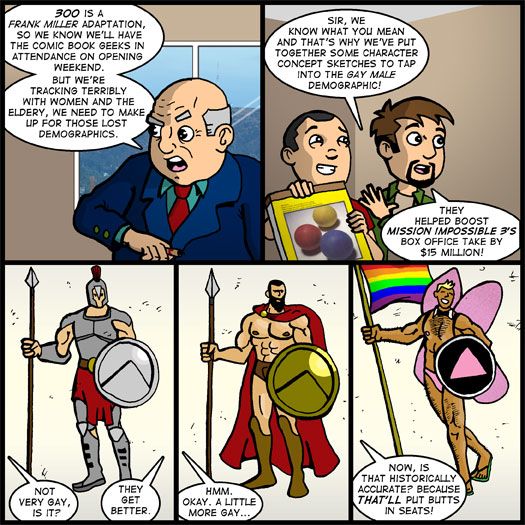 I know it seems a little outlandish that I would assume that the producers of 300 were courting the homosexual male demographic. In all truth, I have nothing to support the claim except for small article I came across at Hollywood Elsewhere weeks ago. Actually, the original observation was made by Variety critic Todd McCarthy and I don’t know if it’s really picked up any steam elsewhere. But I felt it was an interesting, if somewhat comical observation that might rankle the comic book faithful. So I thought it was fertile territory for comedy. I may be a comic book geek myself, but it doesn’t mean that I don’t know how to have fun!