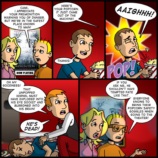 I cop to a continuation of the joke from Monday’s strip, but I don’t feel bad about it. I have a joke in mind for Friday’s comic that I think will wrap this little arc up into a nice, neat package. Besides, it’s not like there’s anything else besides Premonition coming out this weekend.