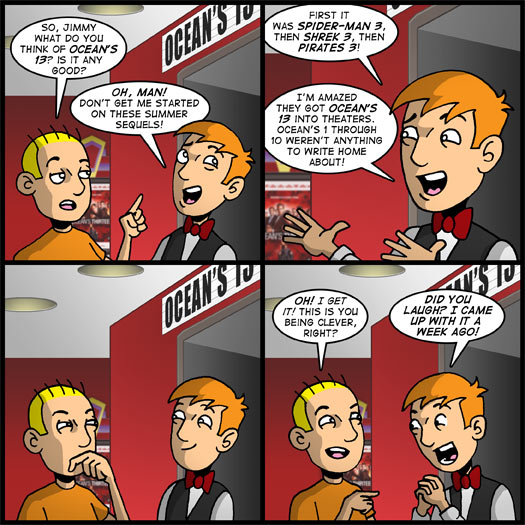 I’ll admit that the idea for Ocean’s 1 through 10 as verbal confusion probably isn’t a new one and that most of you probably look at this joke like “Yeah, and?…”