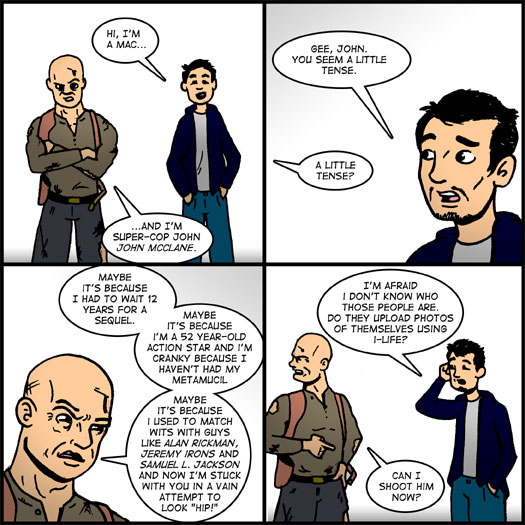 It may seem a little cheap to do a parody of the “;I’m A Mac…”; tv spots, but when Live Free or Die Hard slaps Justin Long in their movie as the comic sidekick to Bruce Willis, that’s low-hanging fruit too delicious to ignore.