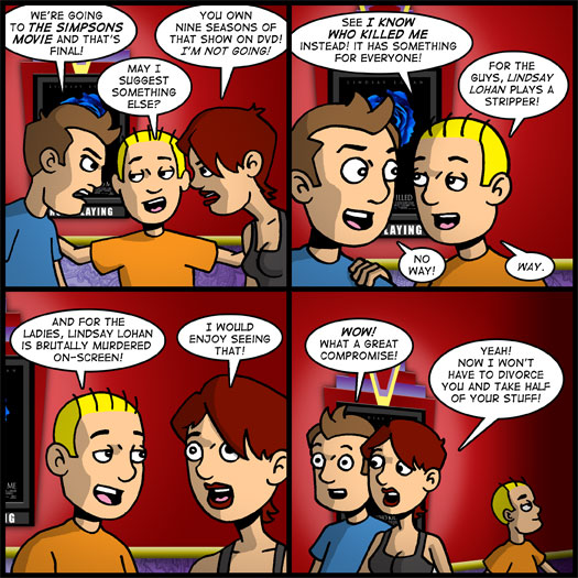 Hey, guys – Don’t forget to check out tonight’s broadcast of The Triple Feature over at Talkshoe. We go live at 9:00 PM CST. Not sure what we’re talking about this week, but odds are good that it isn’t I Know Who Killed Me. Personally, I won’t mind exploring I Now Pronounce You Chuck and Larry. I took a swipe at it in the blog I posted on Saturday (sorry for the delay on Friday’s comic, BTW) and there was some interesting feedback in the comments section. It seems like some people were willing to give the movie a pass, but others were concerned about the film’s dangerous attitudes about homosexuality – even if it was being played for laughs. I might trying bouncing that off Joe and Gordon to see what they think. But odds are good we’ll probably spend most of the hour talking about The Simpsons Movie.