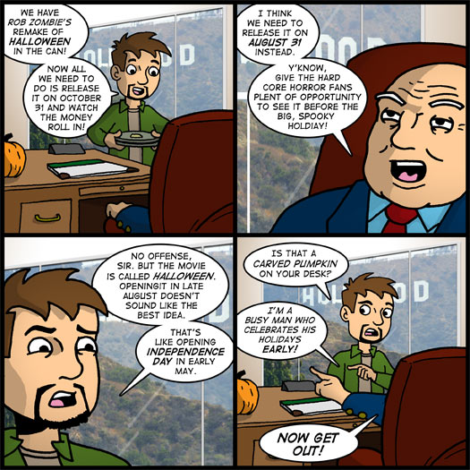 I think today’s comic illustrates fairly effectively my gripe with the release of Rob Zombie’s “reimagining” of Halloween. One would like to think the studio releasing it has some kind of strategy. But to avoid releasing the film on the holiday it shares a name with seems like a glaring oversight to me.