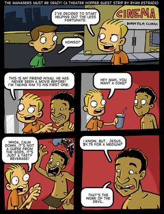 Reading the e-mails and forum discussions that spawned from Wednesday comic, I stuck to my guns at first. Partly because there’s no such thing as bad press and I wanted people to continue talking about the comic. I was also interested in seeing where the conversation would go. During the debate, I claimed that leaving your trash in the theater is a small way to “stick it to the man.”