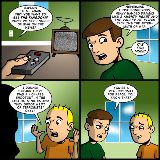 I was thinking about The Kingdom being released on Friday and how it’s one of only a handful of post 9/11 movies that treats the conflict in the middle east as action movie fodder. More often than not, movies about the war on terror have centered around the politics that got us there like Syriana, the misgivings of war through parabal like Jarhead or the aftermath and heartbreak of war like A Mighty Heart or The Valley of Eljah. That’s fine. I understand where these films are coming from. They’re holding up a mirror to our times. I get it.