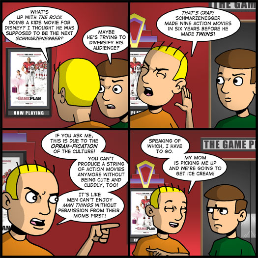 I’m not as adverse to Dwayne “The Rock” Johnson making kids movies as I depict myself in this comic. But I have to admit scratching my head in puzzlement when I first saw the trailer for The Game Plan. THIS was the guy that was supposed to replace Schwarzenegger? It might be a moot point. Truthfully, I don’t think we’ll ever see another era in action movies quite like what we had in the early 80’s. To that end, The Rock is smart for doing a kids movie – if it’s well crafted. As my good friend Joe pointed out, “one needs only say The Pacifier to know that even a successful family vehicle can stall an action heroes career.”