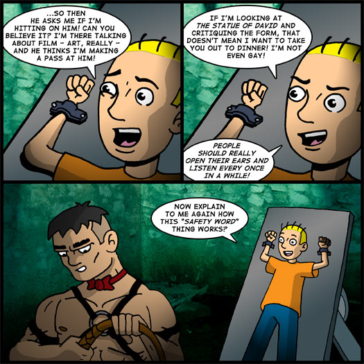 I swear, any more when I use Victor, his behavior gets more and more extreme while Tom’s reaction to it becomes more and more blind. I suppose I only have one person to thank for this – Brandon J. Carr. He’s the dude who came up with the Victor subplot in a guest strip way back in March of ’06. Guess what? Now he’s got his OWN comic to do that in!