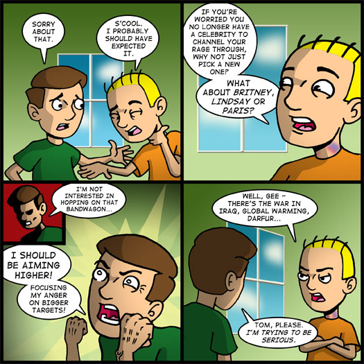 Okay, I know that’s a little sanctimonious. But I’m making fun of myself just as much as the culture that spawned me. Jared’s discriminating taste in regard to a celebrity he chooses to focus his hatred on is a fairly minor concern in the large scheme of things. But how many people do you know retreat into the world of celebrity-bashing when the Real World becomes too oppressive. Exactly. They have a whole network that revolves around it, for goodness sakes!