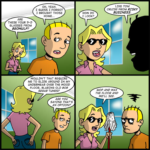 Of course, I don’t know if I’m winning any points in the timeliness department with my reference to Risky Business in today’s strip. But at least it’s slightly more well-known than They Live. I told Cami about the set up to this comic and she said “Will your readers even know what Risky Business is?”