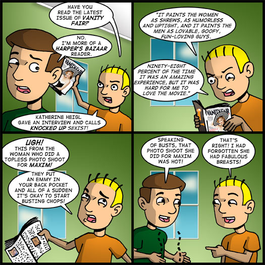 Not being a woman, I can’t speak with any authority as to Heigl’s claim that Knocked Up is sexist. But as a man, I think there is enough to take umbrage in the depiction of my gender as slothful, stoned, ambitionless tubs of lard. In fact, I would be willing to wager that Knocked Up is more sexist in it’s stereotypes against men than it is against women. It would be one thing if the movie had Heigl’s character walking around barefoot and cooking Seth Rogen’s character dinner in every third scene. But that’s not the case. I think they treat her character with great respect. She’s a responsible professional. She has strong family bonds. And she has dimension of character! She’s responsible, but has a one night stand. She drives her niece’s to school but she gets hormonal like a normal pregnant woman would. If you want sexist, look at the punchline of today’s comic. Now THAT’S sexist!
